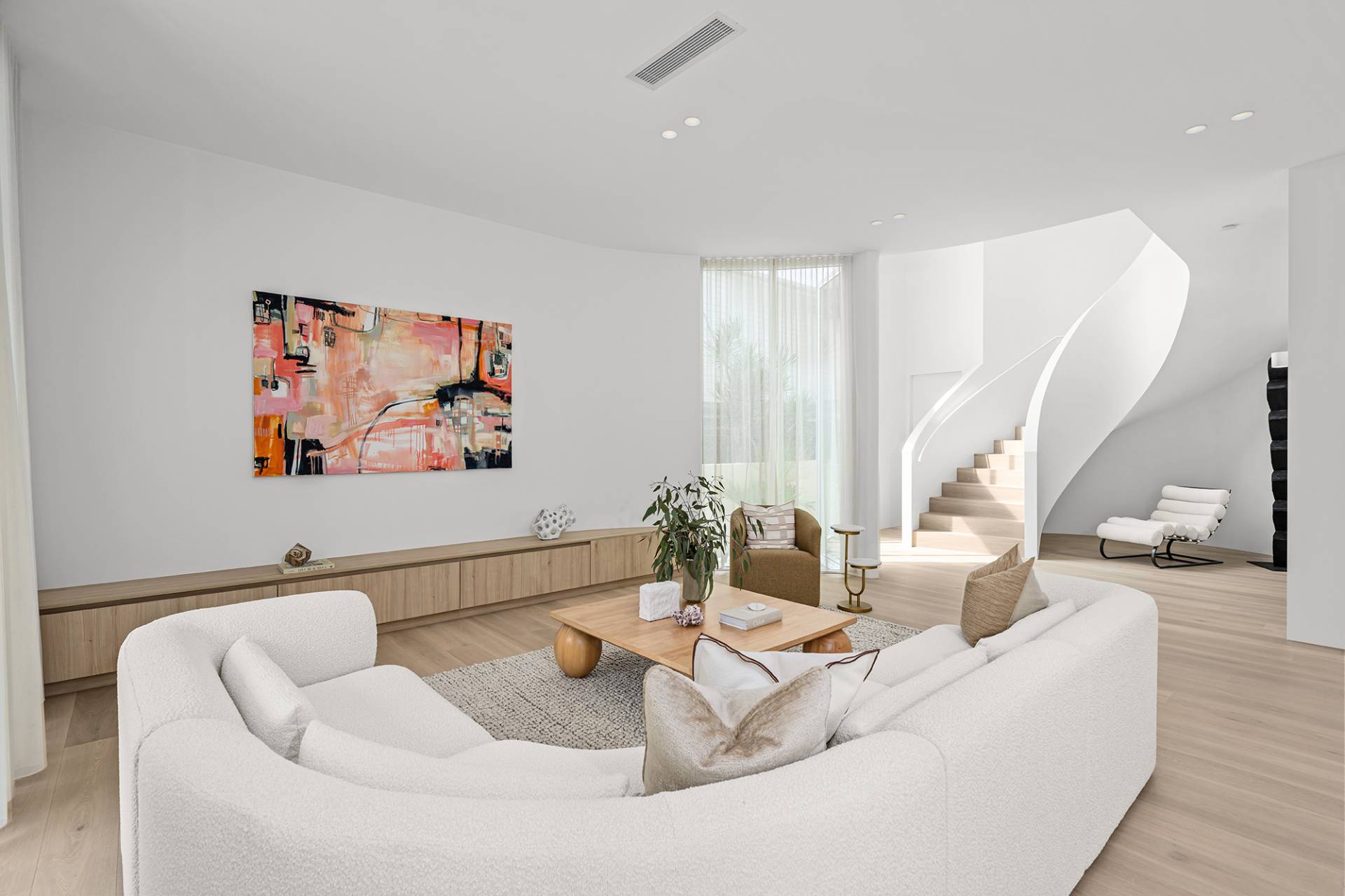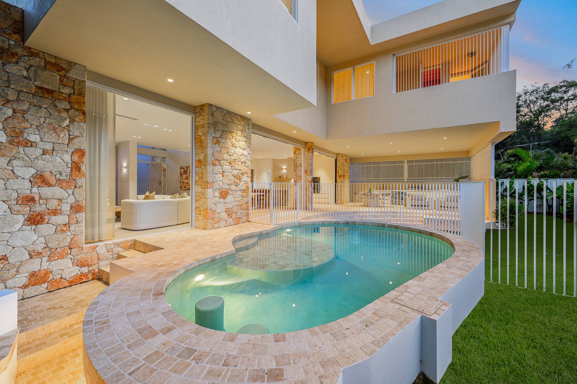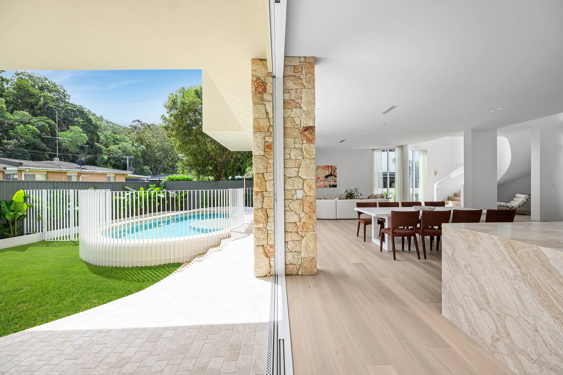 Designed by Habitat Studio Architects, the double-storey home had curves in all the right places and featured bespoke stonework, a sleek spiral staircase and lavish poolside entertaining area.